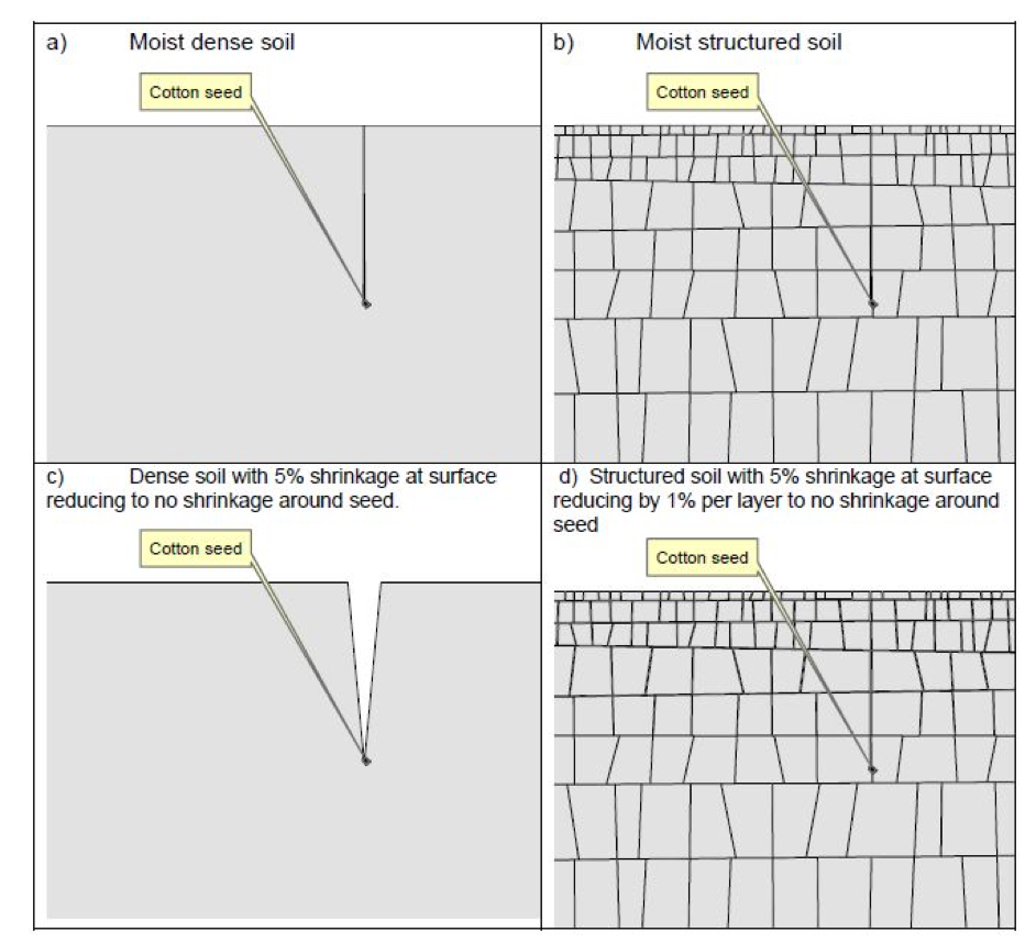 Moisture-seeking cotton seed becomes more problematic in soil types that have shallow or poorly structured topsoil. A study by Hulme (2015) showed that moisture seeking seed in poorly structured topsoil is likely to lead to “Kinze” cracking whereby the soil shrinks away from the sown seed in the planting trench, resulting in a failure to take up moisture or establish.