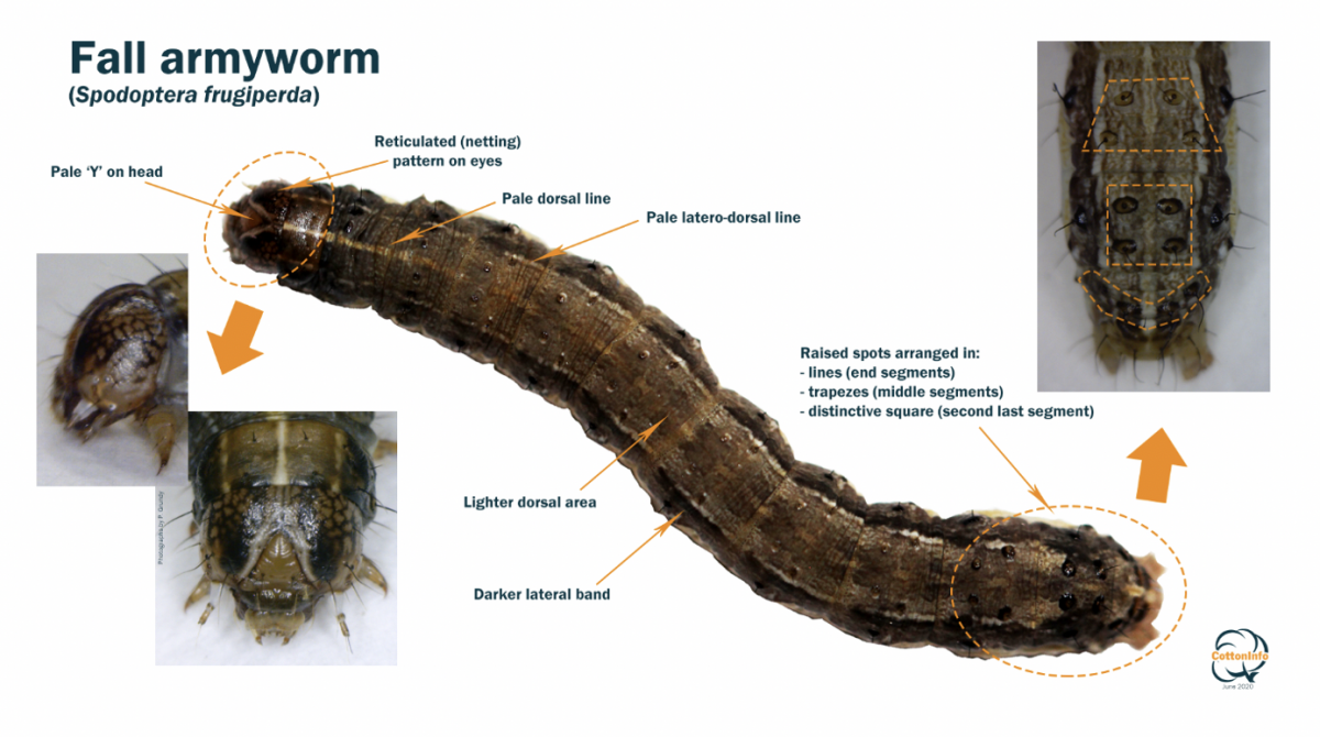 If you find or suspect that larvae of this pest are present in your cotton fields (on either Bollgard or non-Bt cotton refuges) please notify your local CottonInfo REO or the industry’s IPM Technical Lead (Paul Grundy) so that steps can be taken to verify an identification. This is important as many researchers are currently trying to understand the pest status and host range for FAW. Fall armyworm can be very difficult to distinguish from Helicoverpa spp. when they are small (<15mm) in size, becoming easier to identify as they become larger. Some of the key characteristics are depicted on the larval image below and in this YouTube video.