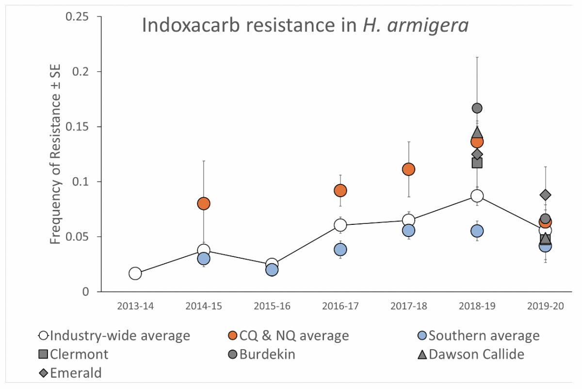 Resistance levels for many pests have subsided during recent seasons due to the drought-related reduction in cropping and changes in insecticide stewardship. Reduced resistance levels are a positive for the industry but as cropped area increases there are some trends to be aware of: