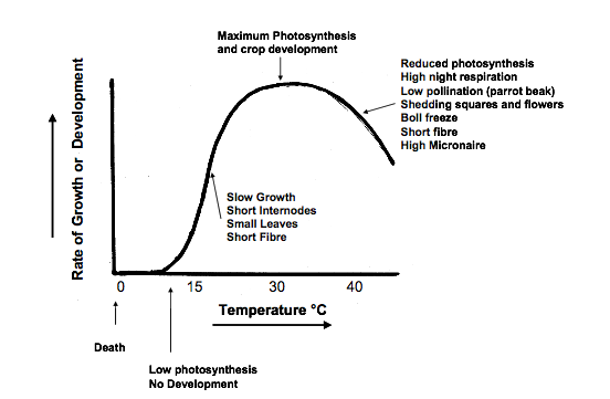 Excessively high temperatures (greater than 35ºC maximum) significantly decrease available assimilates because plant can no longer maintain its temperature in the optimal zone for fruit growth and in turn cause increase in square and boll shedding, and reduce seed number per boll which can all lead to decrease in yield. Loss of fruit may cause the crop to grow excessively vegetative (rank) following the period of heat stress.