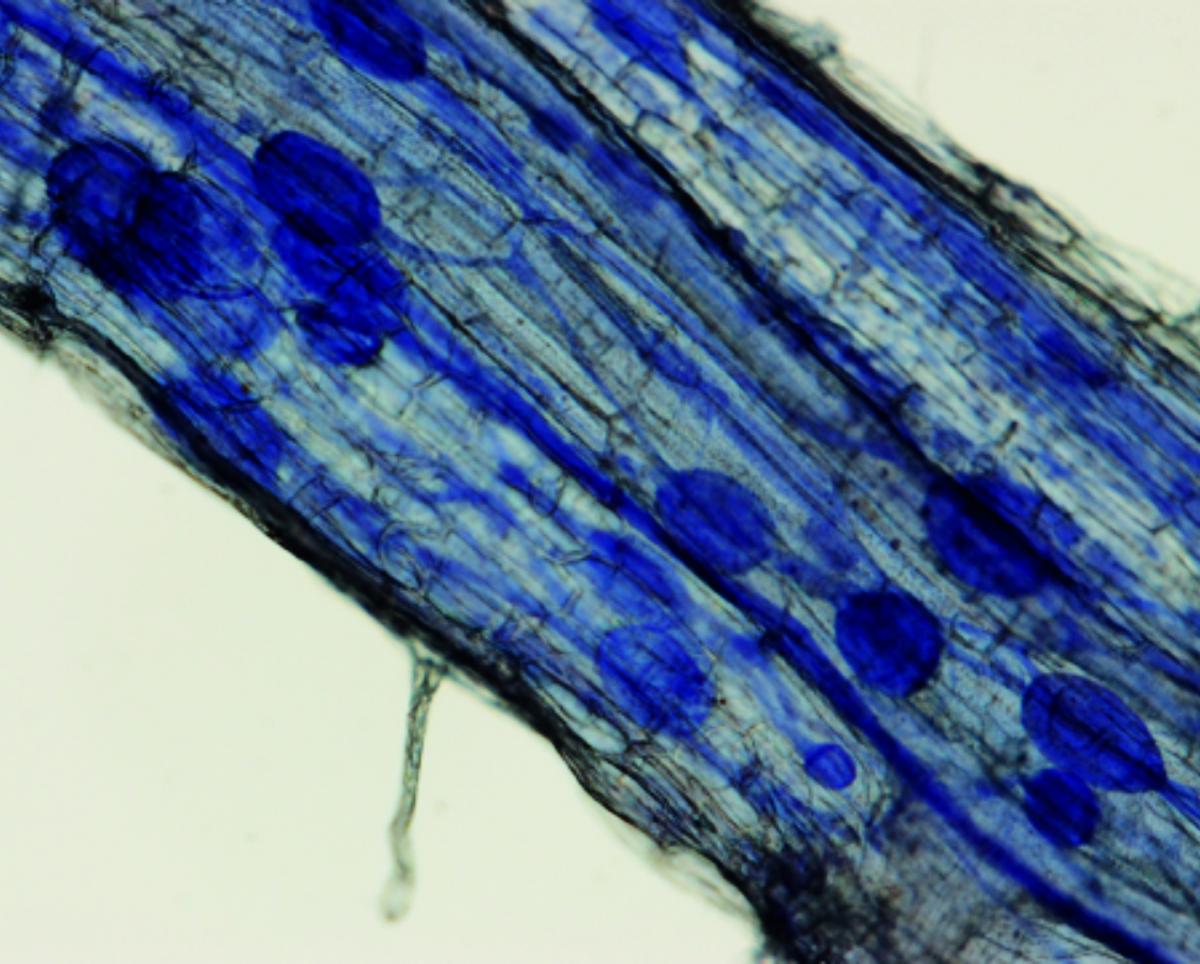 Figure 1: A cotton root that has been cleared and stained. The dark oval structures in the root are the vesicles of AM fungi that have colonised the cotton. Colonisation of cotton, like this, remained; similar across seven years of sampling of a field that received no rain during the millennial drought.