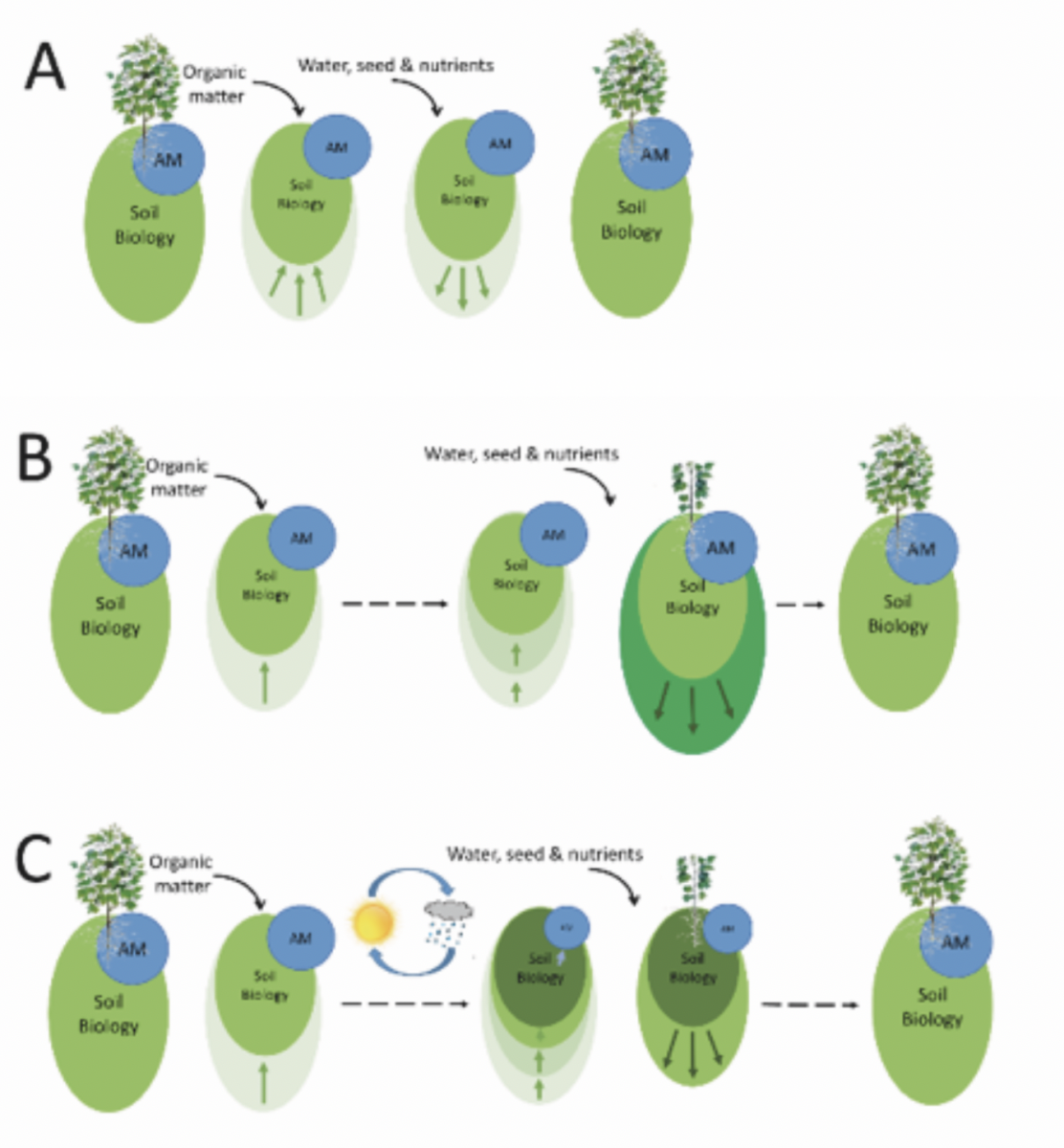 During a drought with wetting and drying cycles (C), the biology is stimulated with each wetting event, living off the organic matter in the soil, but with each cycle this organic matter declines. With no new organic matter/plant inputs the overall biology declines, which includes the AM. When growing conditions return the system takes longer to return to normal and we see more pronounced long fallow disorder and AM colonisation issues as a symptom.