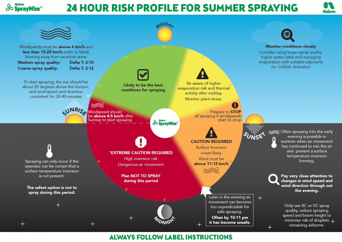 Weather conditions are not only a primary determinant of efficacy, they determine whether the spraying operation should proceed, be delayed or aborted. Weather conditions need to be checked regularly during spray applications and recorded as per label requirements. Growers can subscribe to websites (such as Nufarm's spray wise decisions or Syngenta's weather website) that provide forecasts of conditions for spraying up to 10 days in advance.