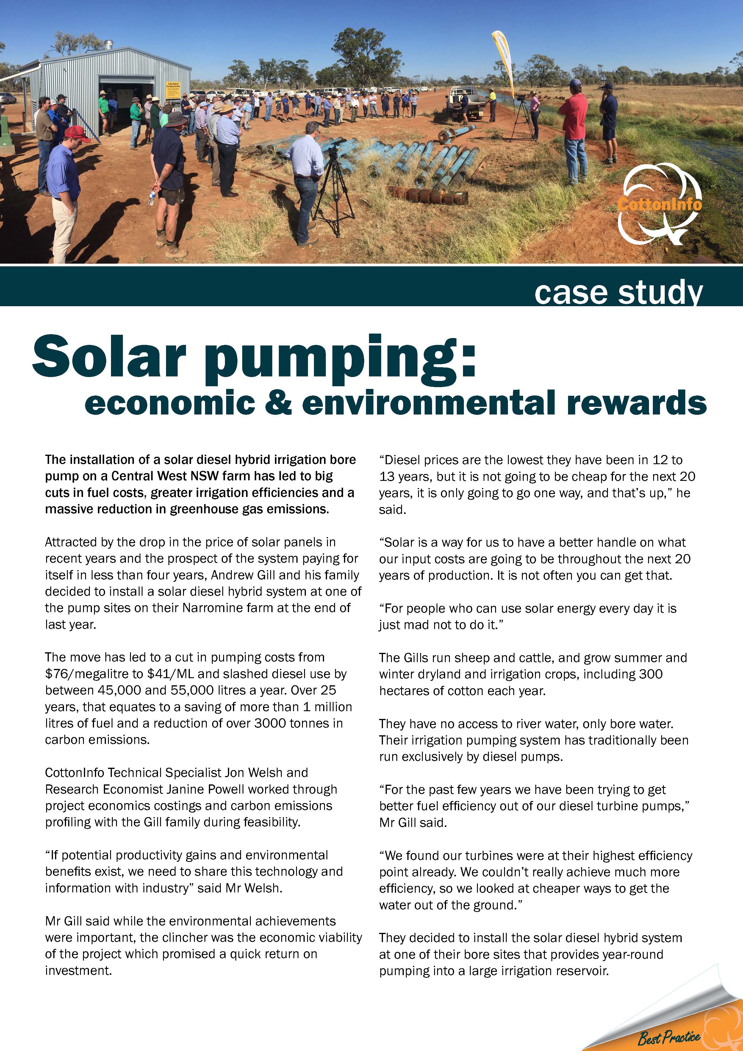 The installation of a solar diesel hybrid irrigation bore pump on a Central West NSW farm has led to big cuts in fuel costs, greater irrigation efficiencies and a massive reduction in greenhouse gas emissions. Attracted by the drop in the price of solar panels in recent y