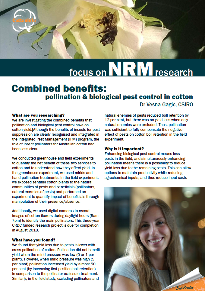The Focus on NRM research series introduces you to the key cotton NRM researchers and their work. In this case study, Dr Vesna Gagic talks about her research into the combined benefits that pollination and biological pest control have on cotton yield.