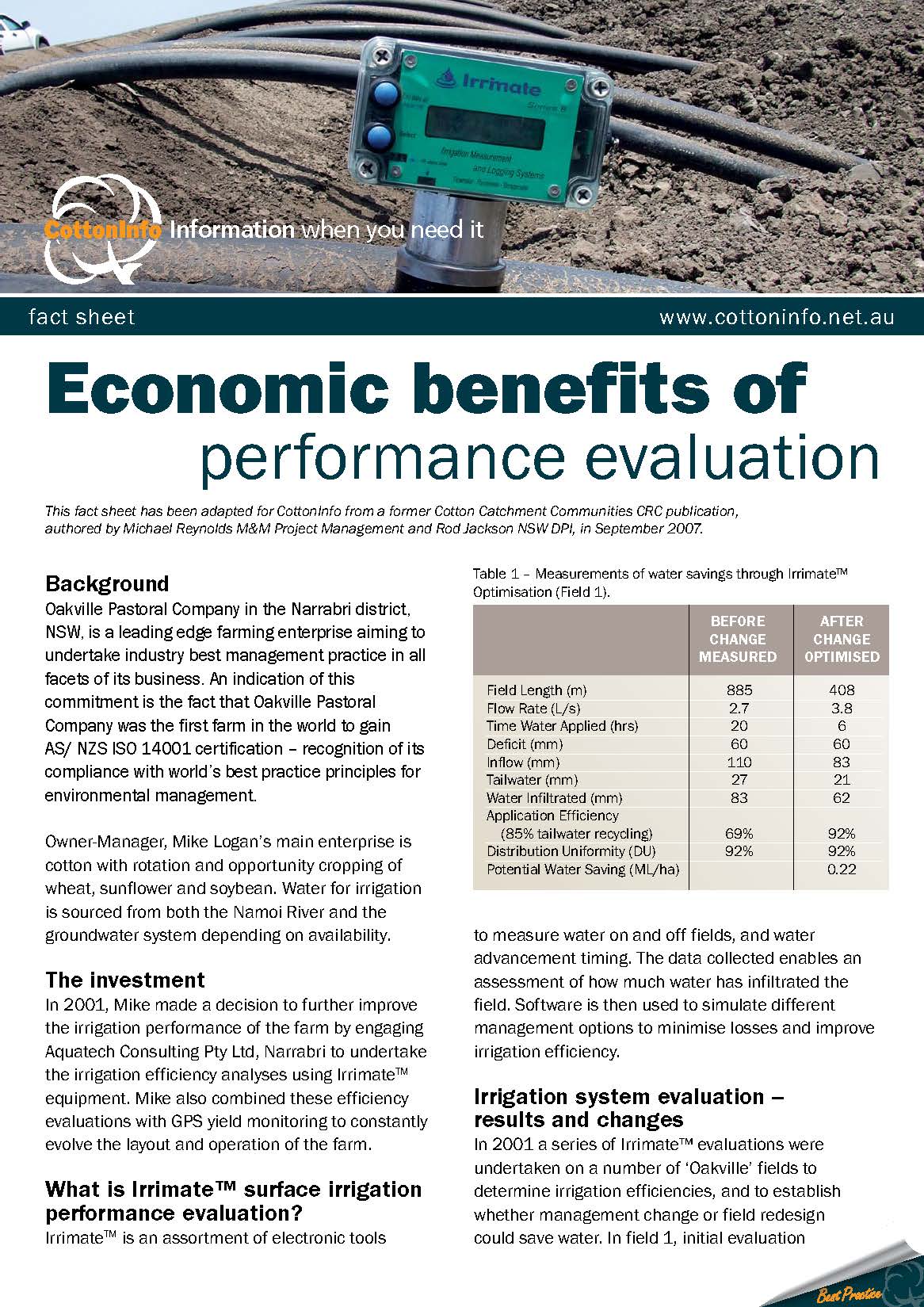 This case study looks at on-farm irrigation efficiency analysis conducted using Irrimate equipment. Irrimate is an assortment of electronic tools to measure water on and off fields, and water advancement timing.