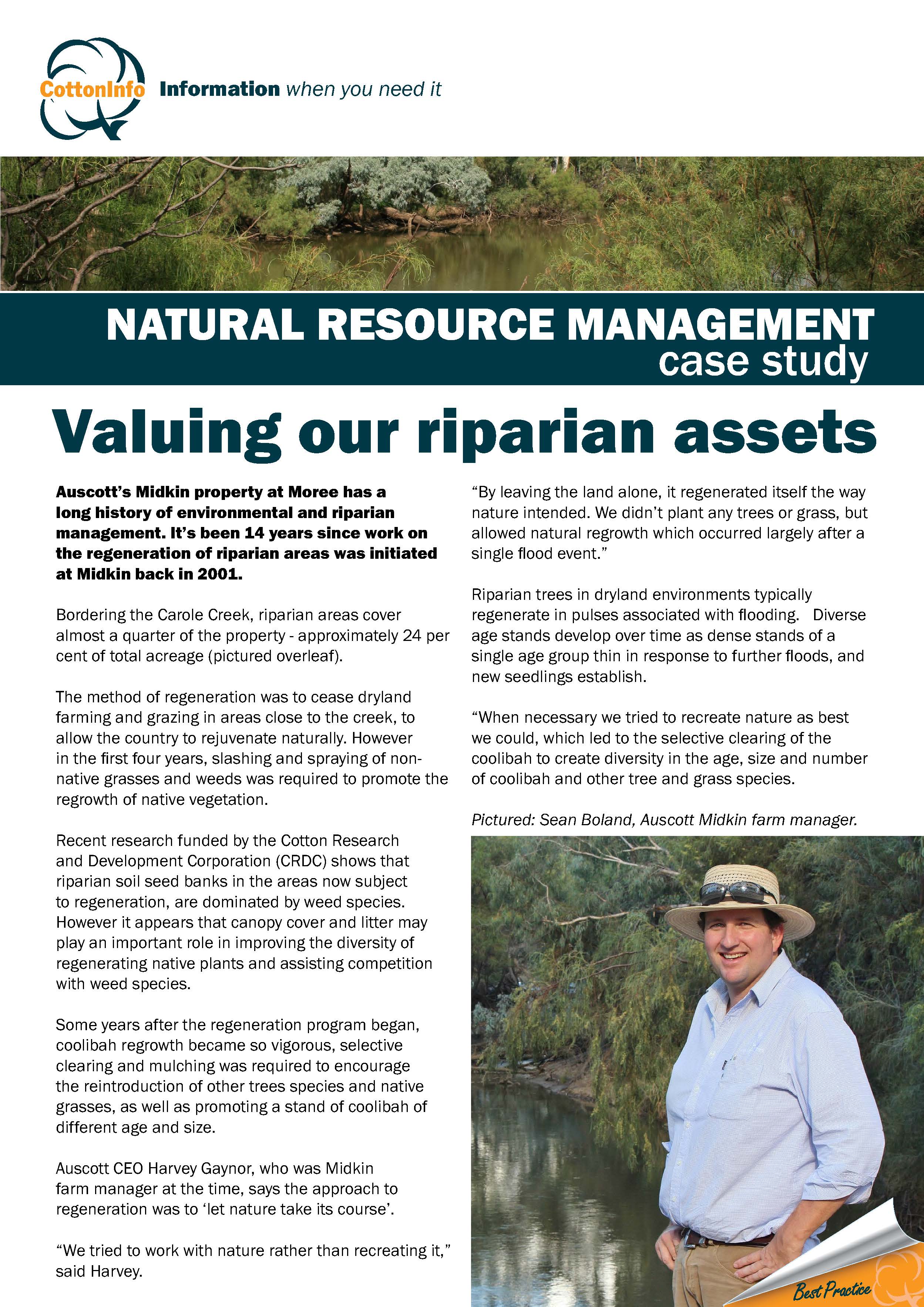 This case study (part of the CottonInfo case study series) focuses on the Auscott property 'Midkin' at Moree, and the work that subsequent farm managers have done to regenerate riparian areas over the past 14 years.
