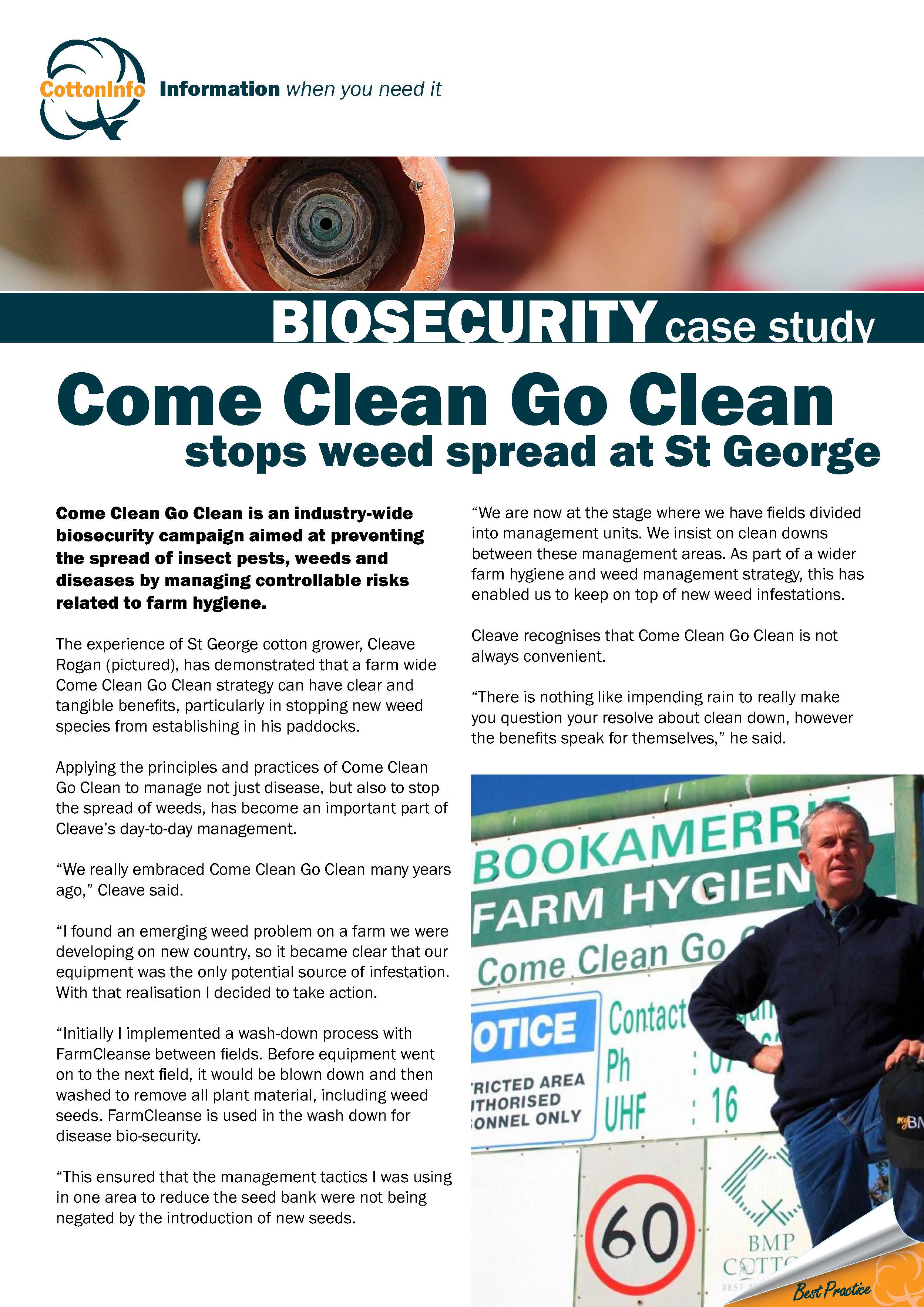 This case study (part of the CottonInfo case study series) focuses on St George cotton grower Cleave Rogan and his efforts on farm to stop the spread of pests, weeds and diseases through Come Clean Go Clean.
