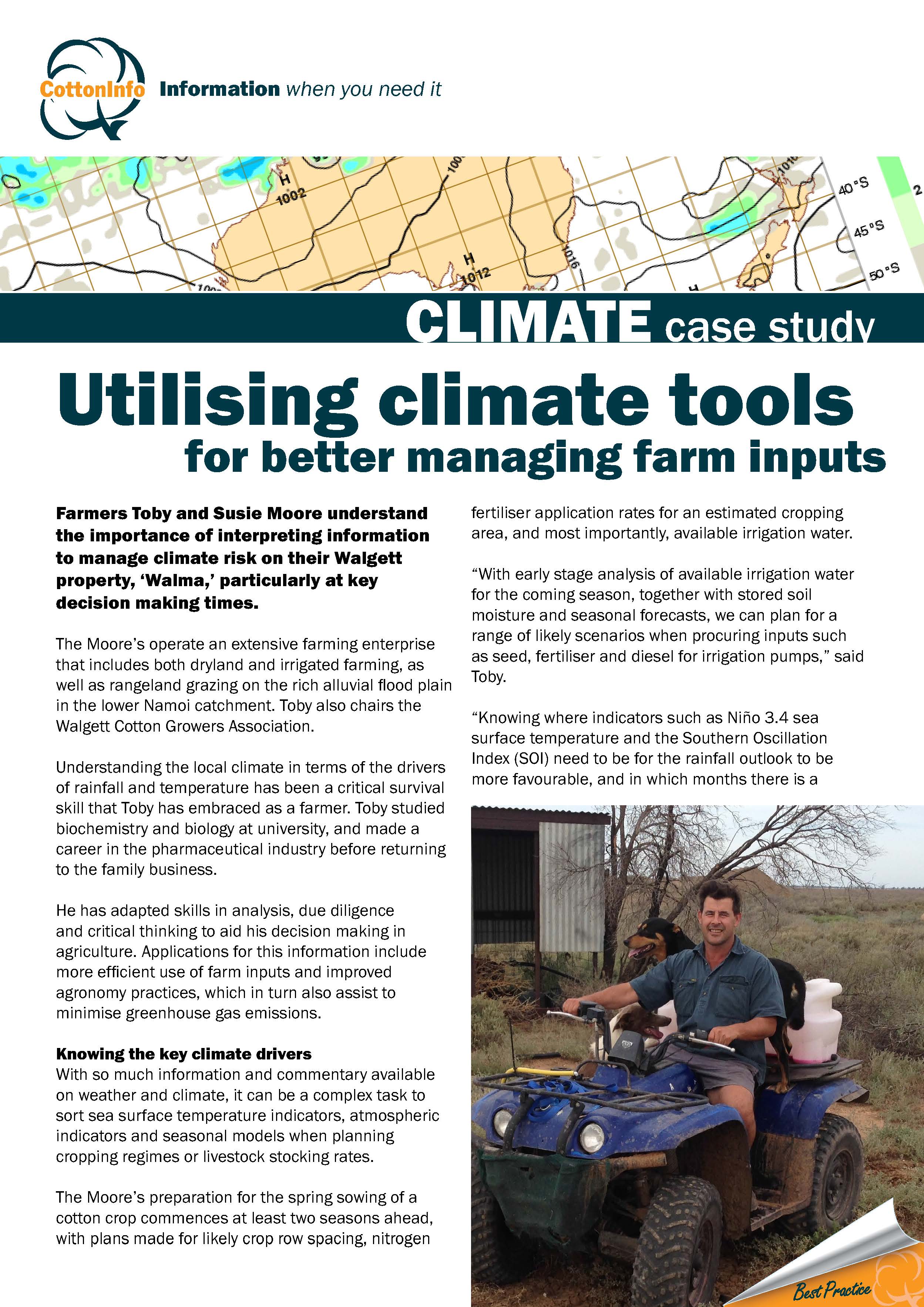 This case study (part of the CottonInfo case study series) focuses on Walgett cotton growers Toby and Susie Moore, and their focus on interpreting weather information to manage climate risk, particularly at key decision making times.