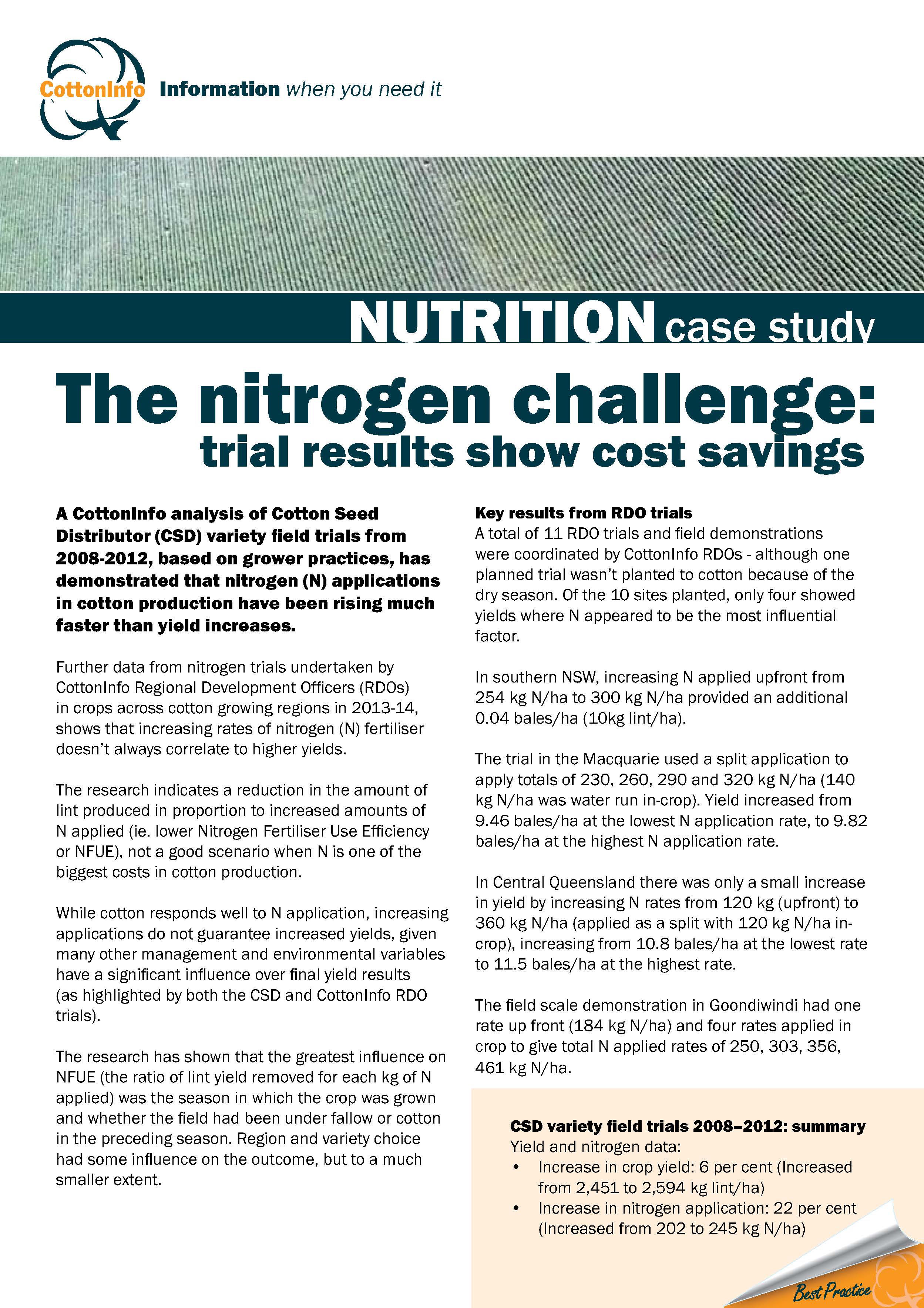 This case study (part of the CottonInfo case study series) looks at the use of nitrogen in cotton production by comparing the outcomes of Cotton Seed Distributor variety trials and CottonInfo regional development officer in-field nitrogen trials. The resulting data indicates a reduction in t