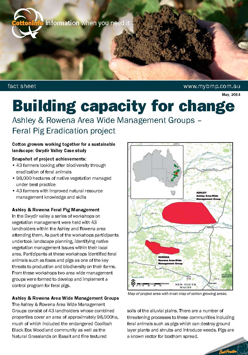 Under the 'Cotton growers working together for a sustainable landscape' project, a series of case studies have been developed. This case study outlines the work of the Ashley and Rowena Area Wide Management Group in eradicating feral pigs.