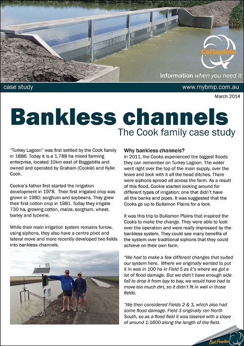 This case study features the Cook family of 'Turkey Lagoon' near Boggabilla, who have recently developed two fields into bankless channels.