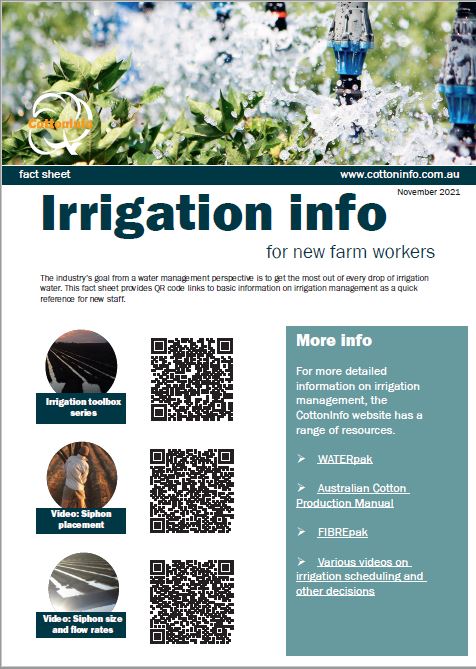 This fact sheet can be printed for new farm staff and provides QR code links to basic information on irrigation management as a quick reference.