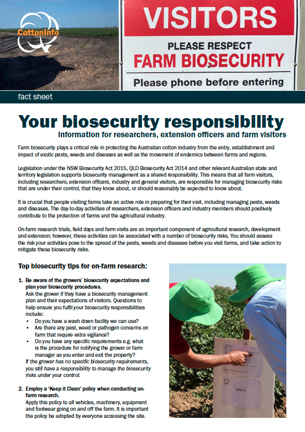 Under state and territory legislation, biosecurity is a shared responsibility. This means that all farm visitors are responsible for managing biosecurity risks. This fact sheet outlines top tips to ensure biosecurity for researchers, extension officers and farm visitors.