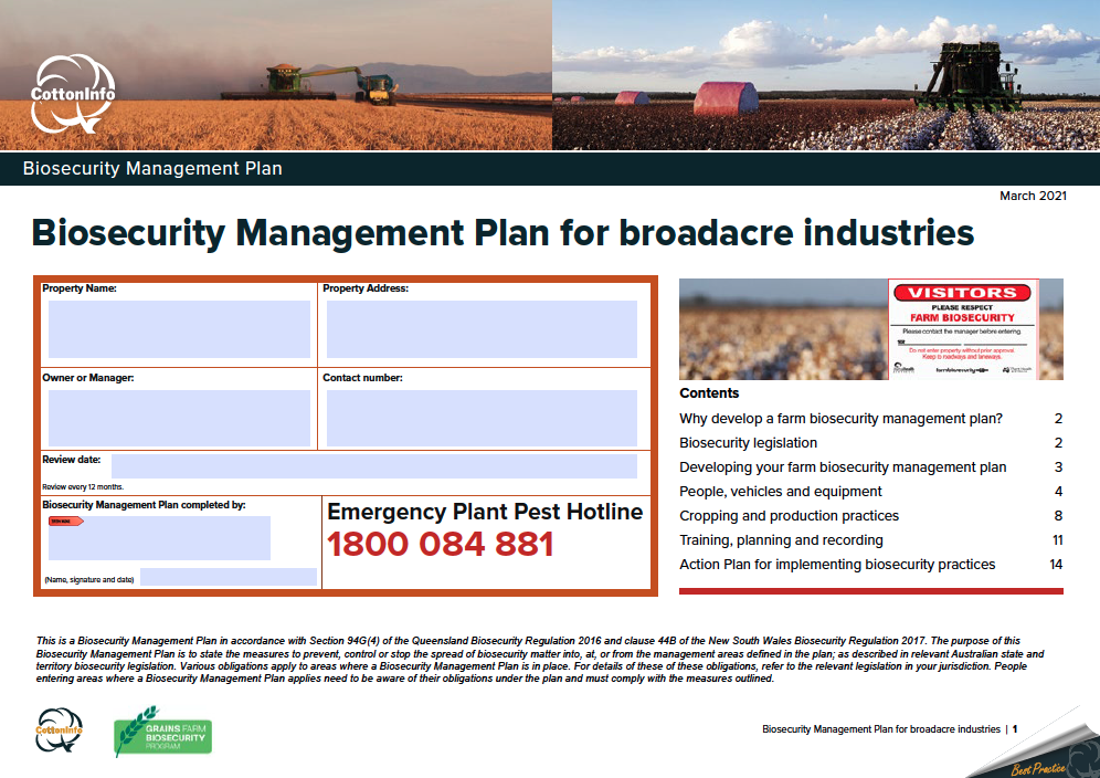 This document provides a template Biosecurity Management Plan for growers in broadacre industries. Updated April 2023.