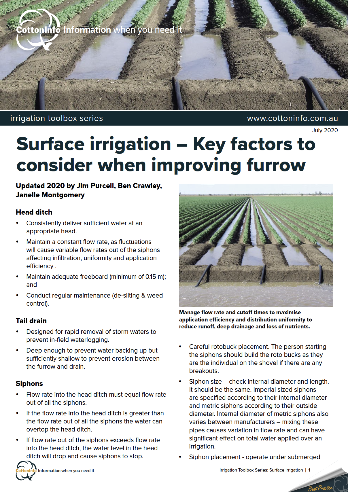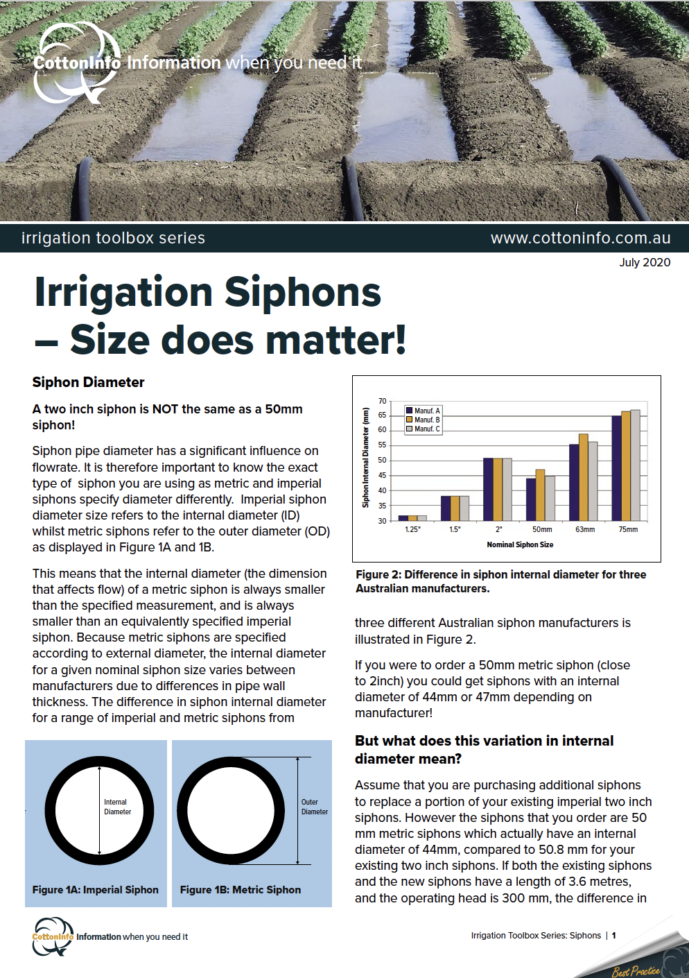 The CottonInfo Irrigation Toolbox Series provides key resources for irrigators. It includes factsheets and videos to help managers and farm staff better understand best practices for an efficient irrigation. This is factsheet #6: Irrigation siphon size.