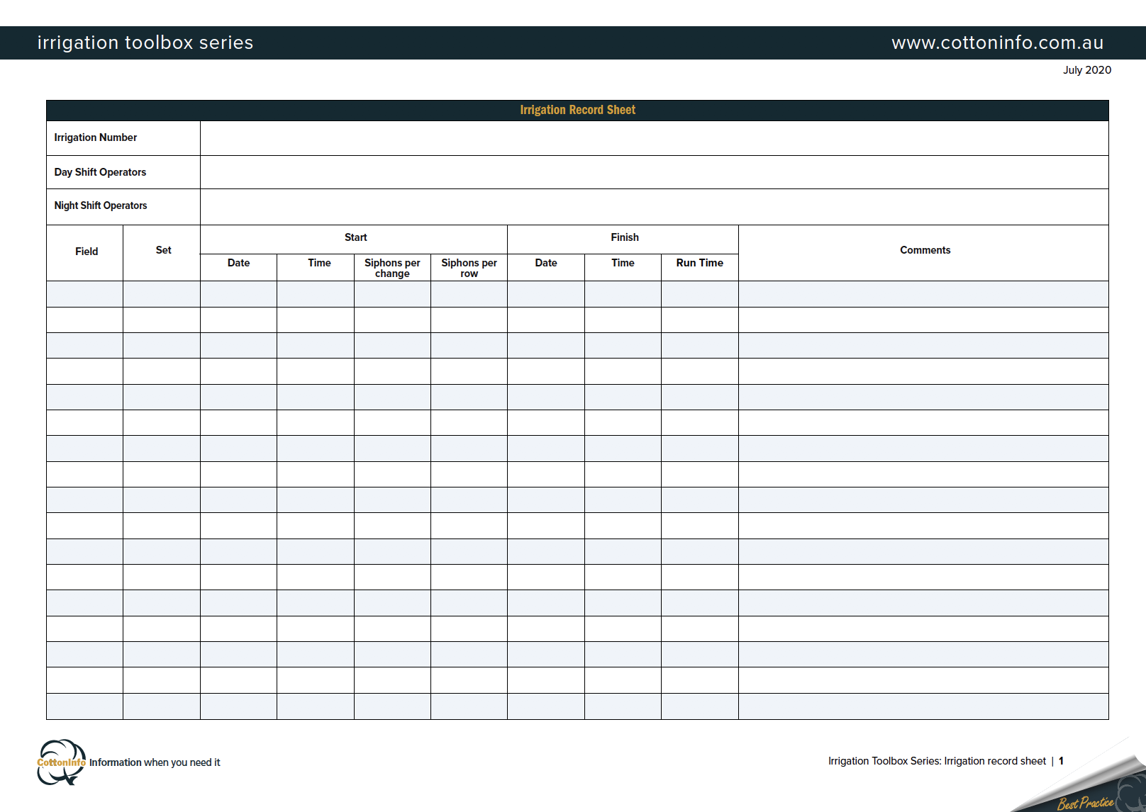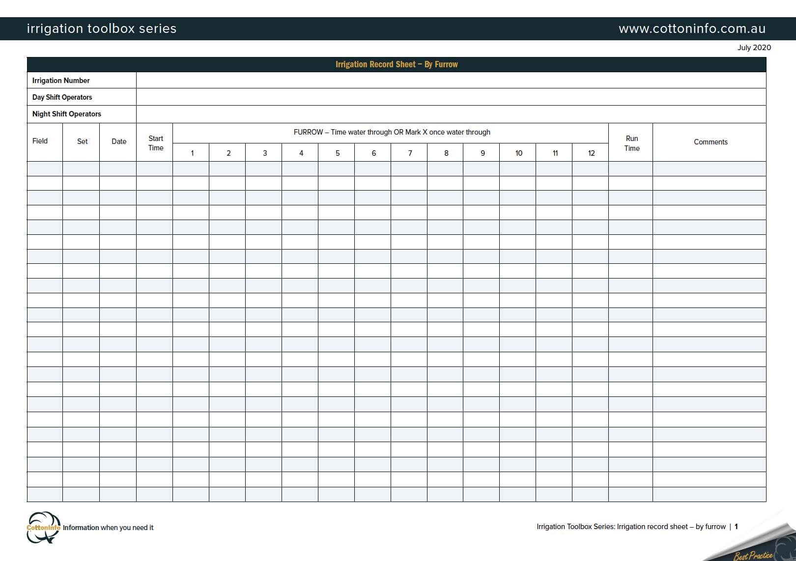 The CottonInfo Irrigation Toolbox Series provides key resources for irrigators. It includes factsheets and videos to help managers and farm staff better understand best practices for an efficient irrigation. This is factsheet #4: the irrigation record sheet.