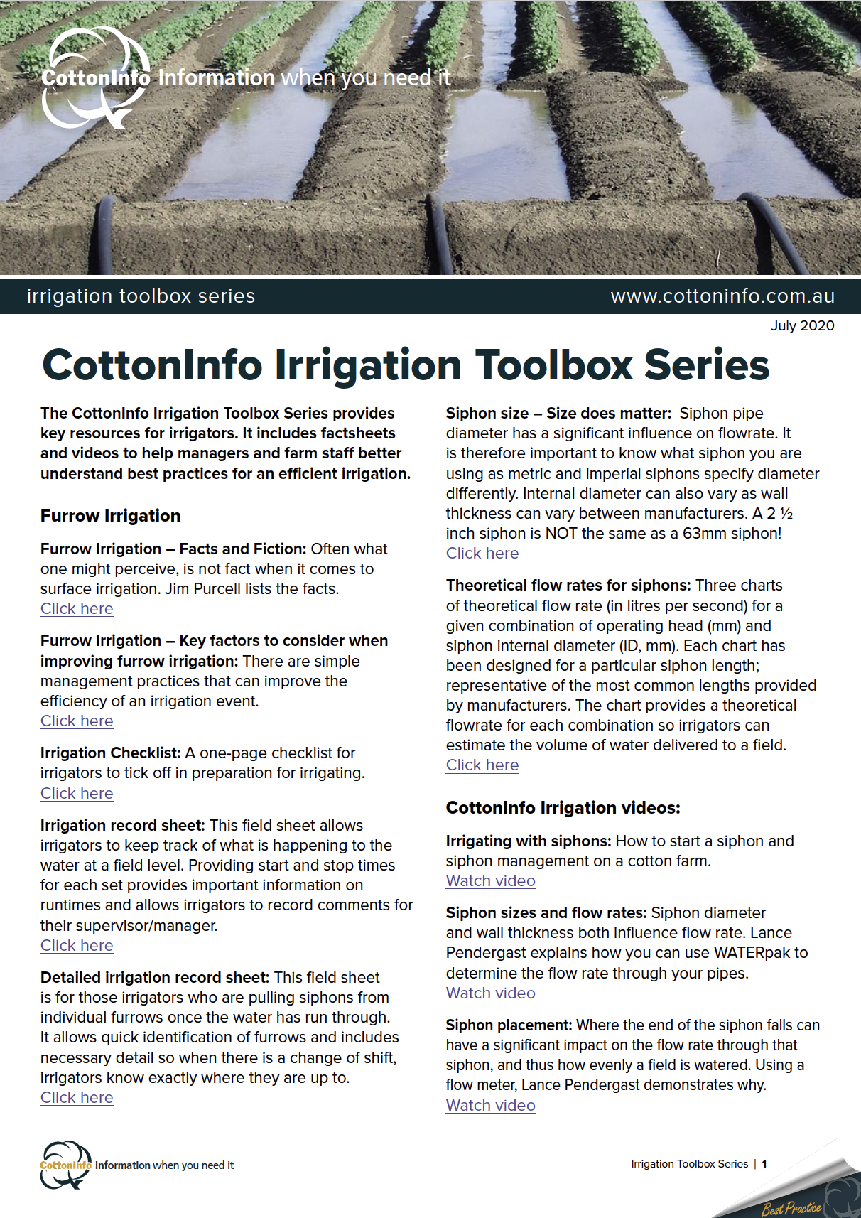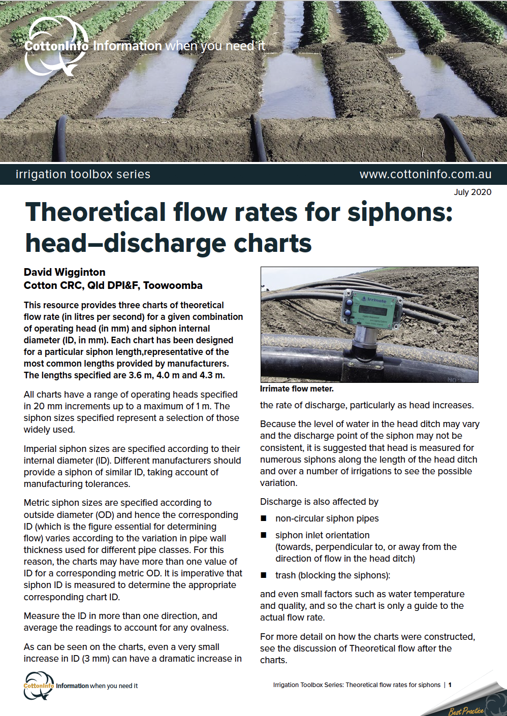 The CottonInfo Irrigation Toolbox Series provides key resources for irrigators. It includes factsheets and videos to help managers and farm staff better understand best practices for an efficient irrigation. This is factsheet #7: Theoretical flow rates for siphons.