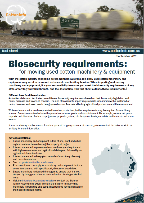 With the cotton industry expanding across Northern Australia, it is likely used cotton machinery and equipment may need to be moved across state and territory borders.