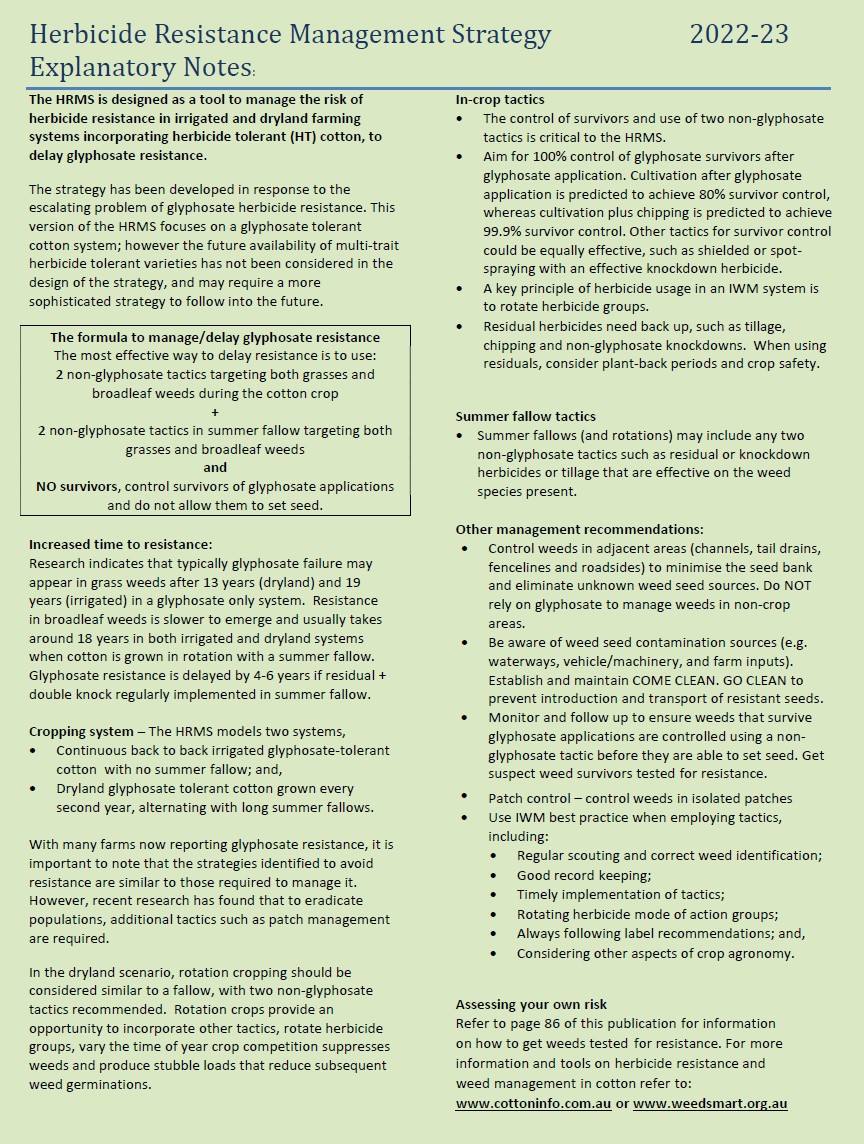 The HRMS is designed as a tool to manage the risk of herbicide resistance in irrigated and dryland farming systems incorporating herbicide tolerant (HT) cotton, to delay glyphosate resistance. The strategy has been developed in response to the escalating problem of glypho