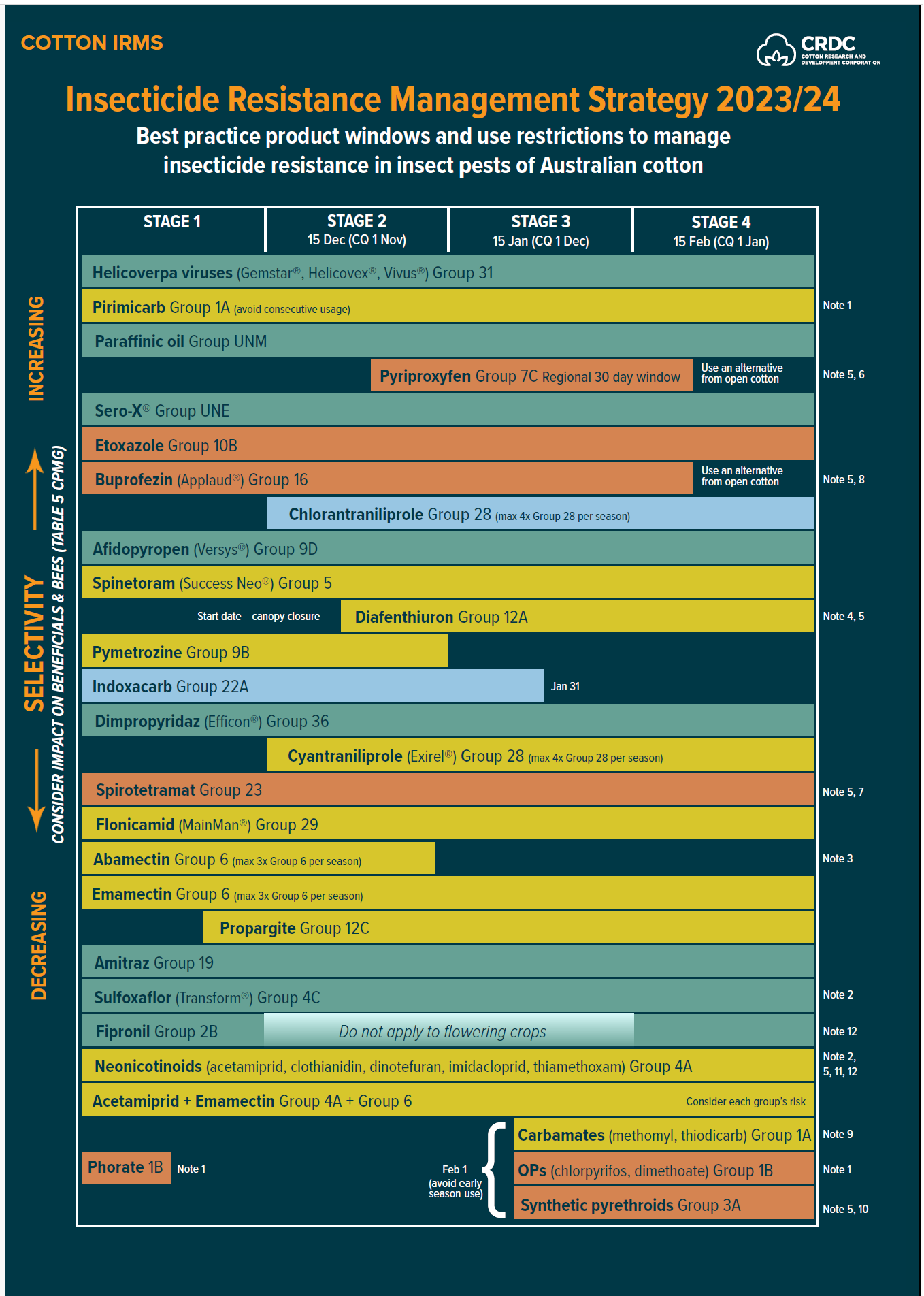 The use of pesticides selects for resistance in pest populations. The cotton industry Insecticide Resistance Management Strategy (IRMS) seeks to manage the risk of resistance in all major pests of cotton including aphids, mites, SLW and Helicoverpa, both in conventional and Bt cotton.