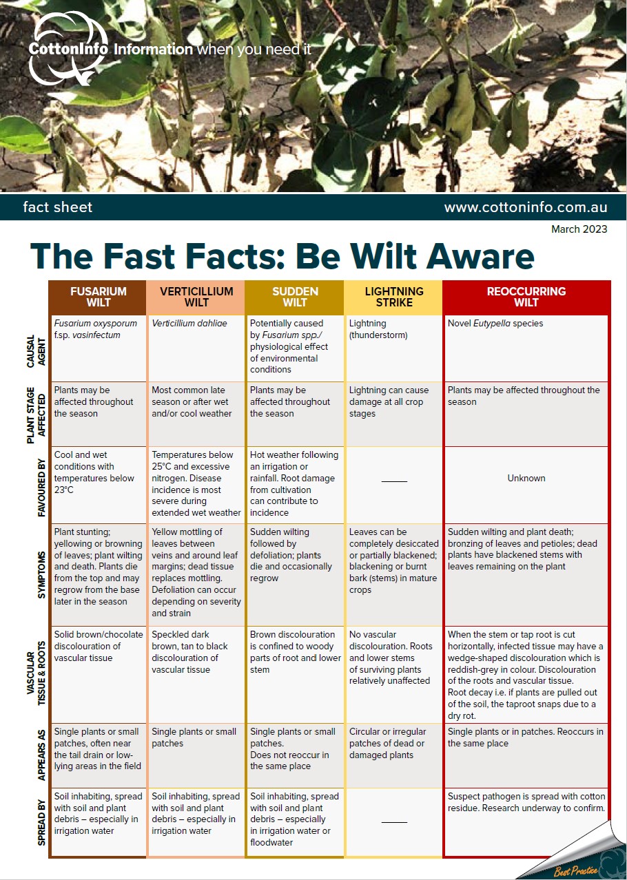 This fact sheet compares four different types of wilt - Fusarium wilt, Verticillium wilt, sudden wilt and reoccurring wilt - plus lightning strikes, so you can be aware of their various causes, symptoms and spread.