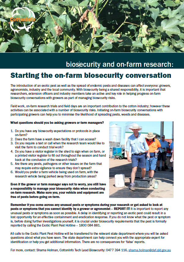 With biosecurity being a shared responsibility, it is important that researchers, extension officers and industry members take an active and key role in helping progress on-farm biosecurity conversations with growers as part of managing biosecurity risks.