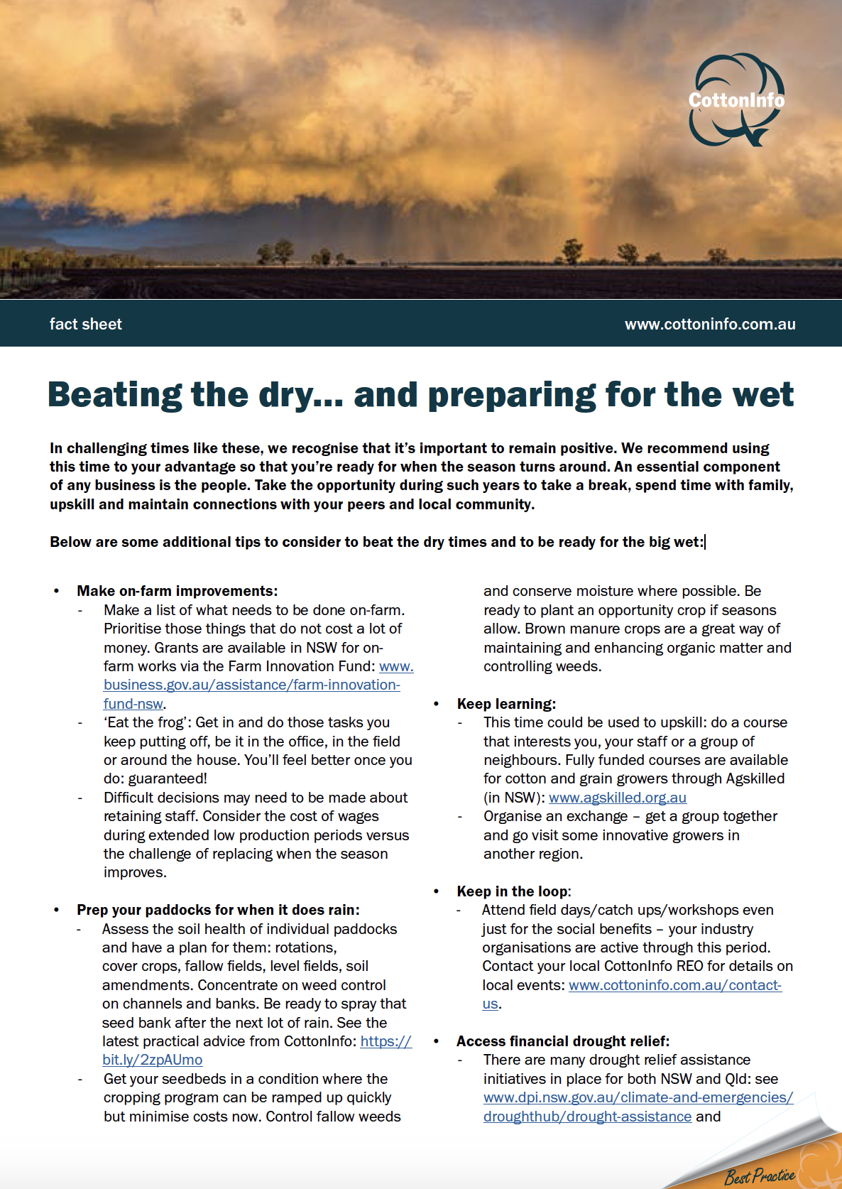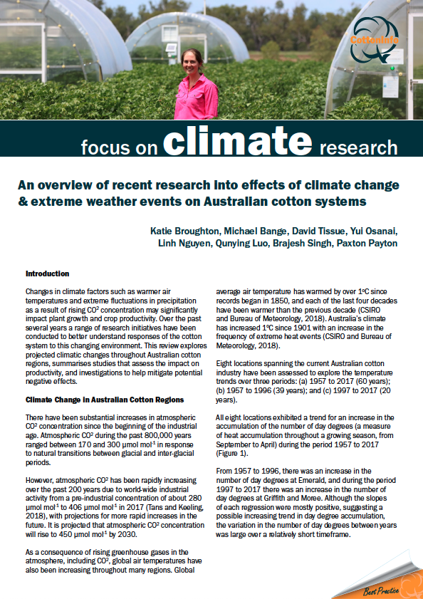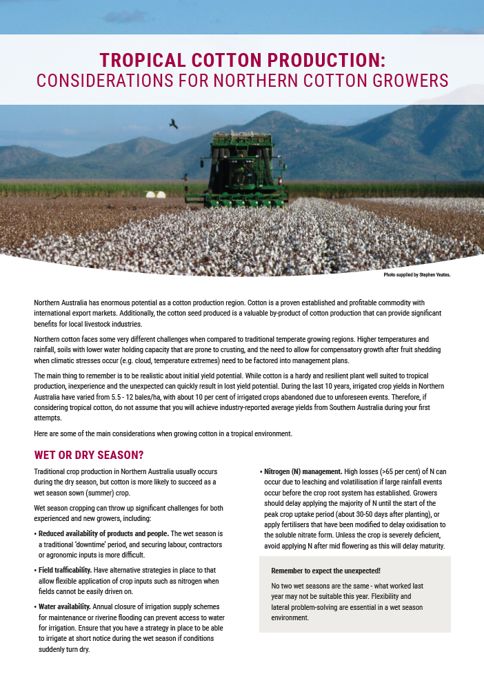 This fact sheet - a collaboration between CRDC, Cotton Australia, CSD, CottonInfo and Bayer - outlines some of the main considerations when growing cotton in a tropical environment.
