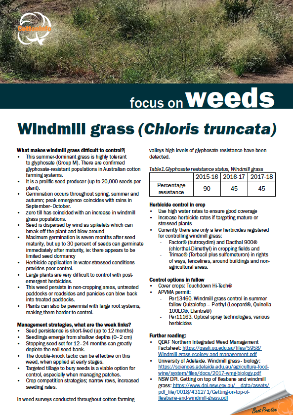 This fact sheet looks at Windmill grass (Chloris truncata) and its associated management strategies.