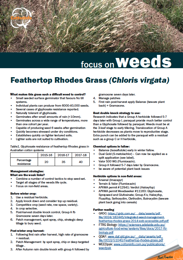 This fact sheet looks at Feathertop Rhodes Grass (Chloris virgata) and its associated management strategies.