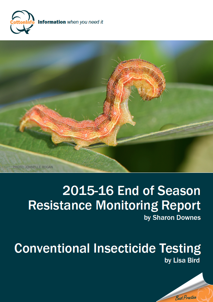 The End of Season Resistance Monitoring Report, by Sharon Downes, and the Conventional Insecticide Testing Report, by Lisa Bird provide a summary of the outcomes of both programs during 2015-16.