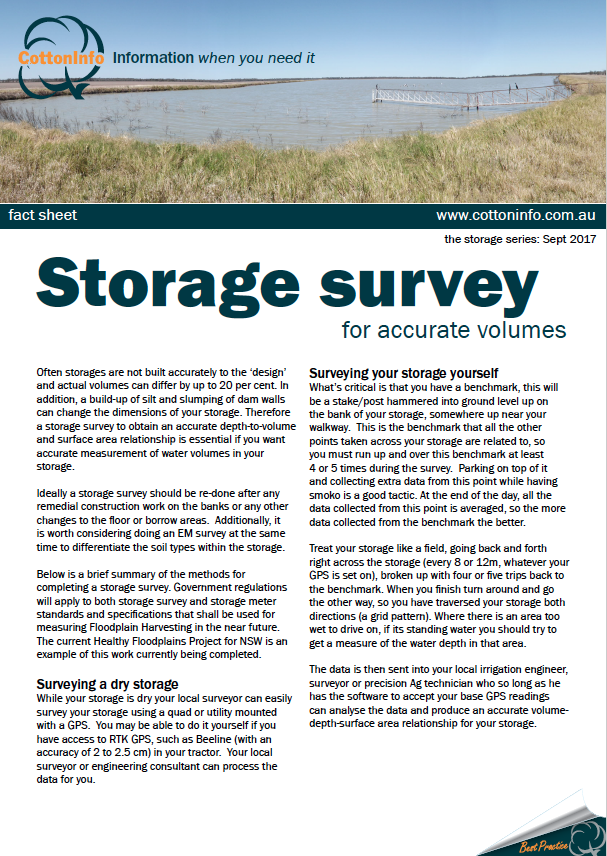 A storage survey is essential for growers wanting accurate depth-to-volume, surface area and water volume measurements of their storage dams. This fact sheet outlines the methods for completing a storage survey.