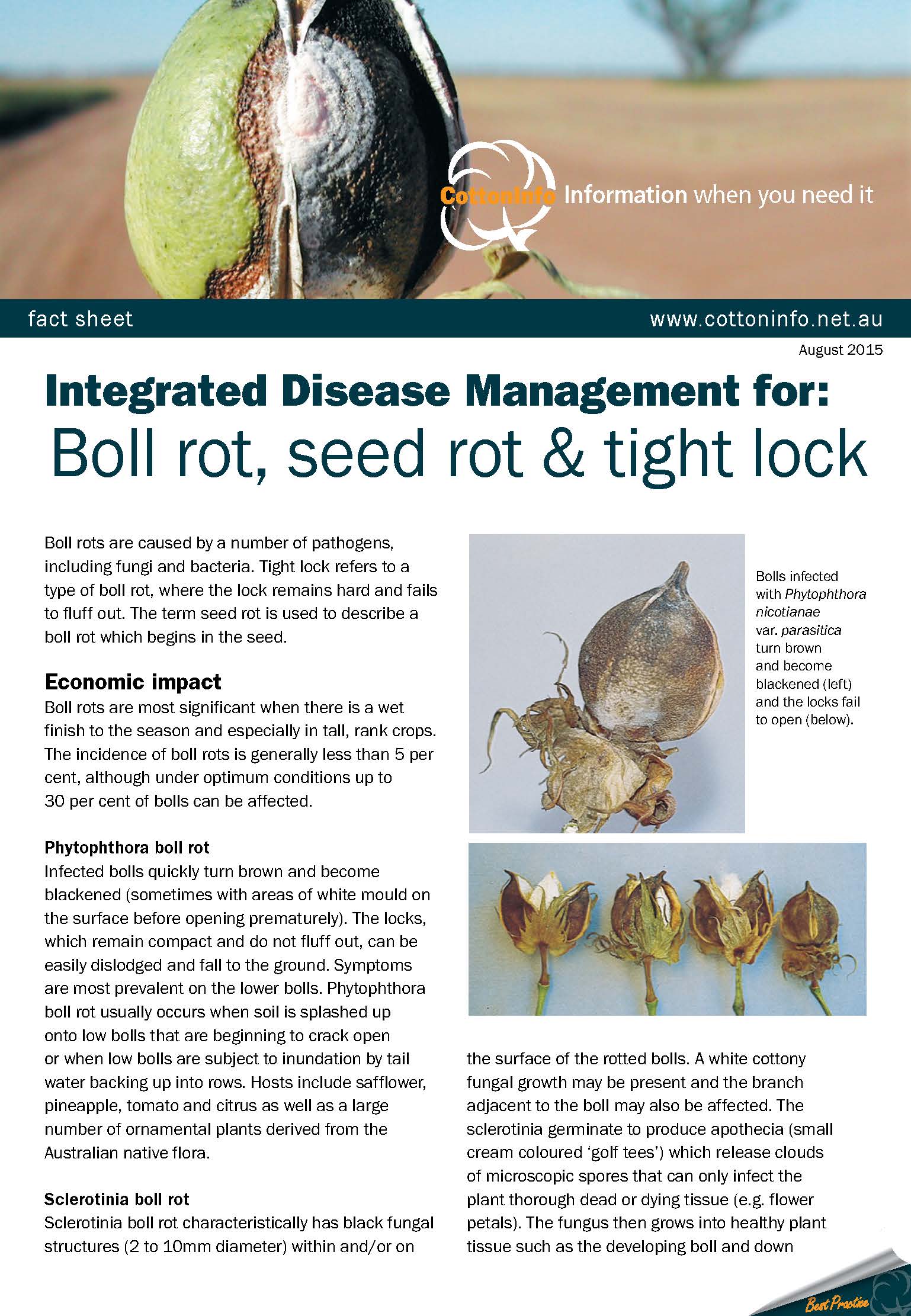 This fact sheet, one of the CottonInfo Integrated Disease Management (IDM) fact sheets series, looks at the IDM strategies to control boll rot, seed rot and tight lock.