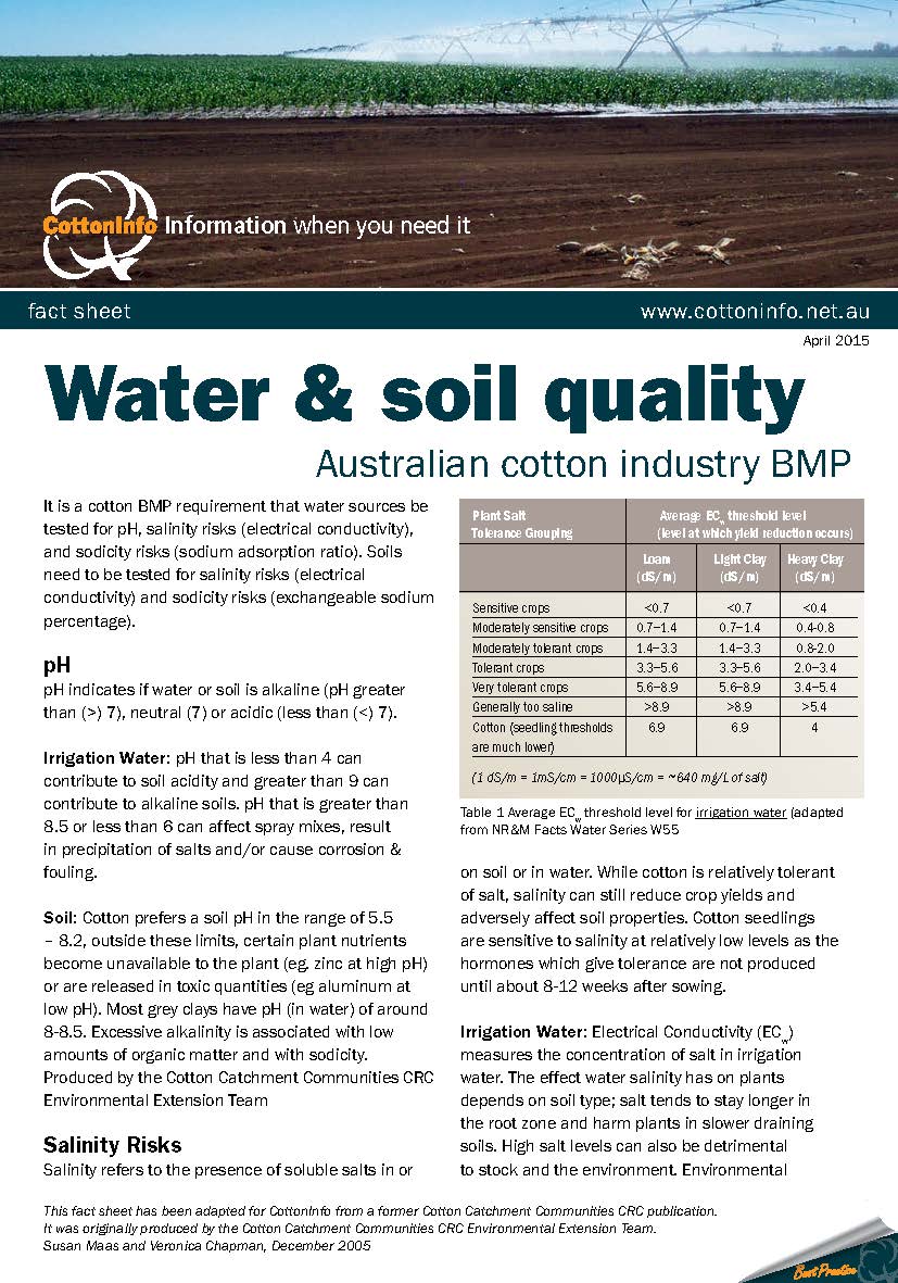 This fact sheet outlines testing water and soil quality for pH, salinity risks and sodicity.