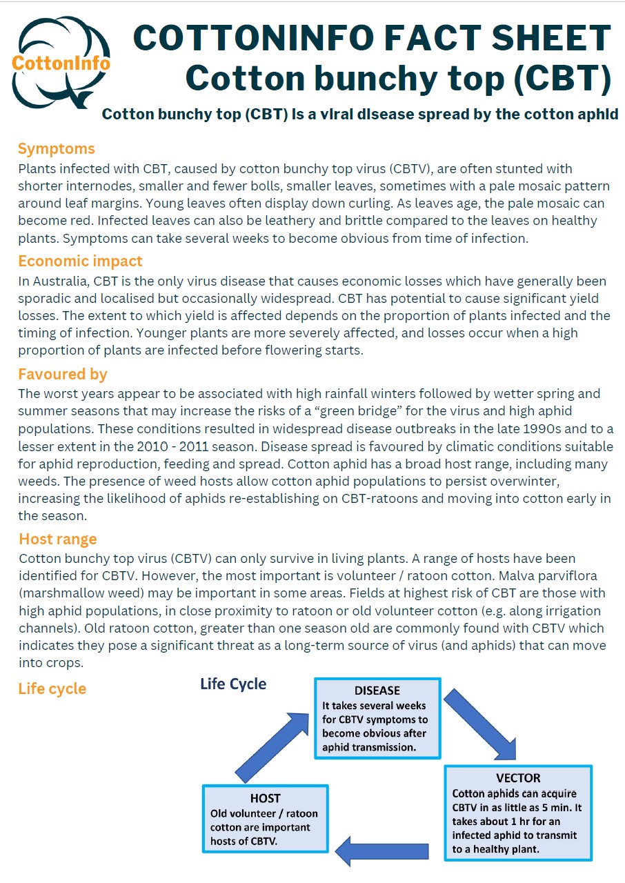 This fact sheet, one of the CottonInfo Integrated Disease Management (IDM) fact sheets series, looks at the IDM strategies to control cotton bunchy top.