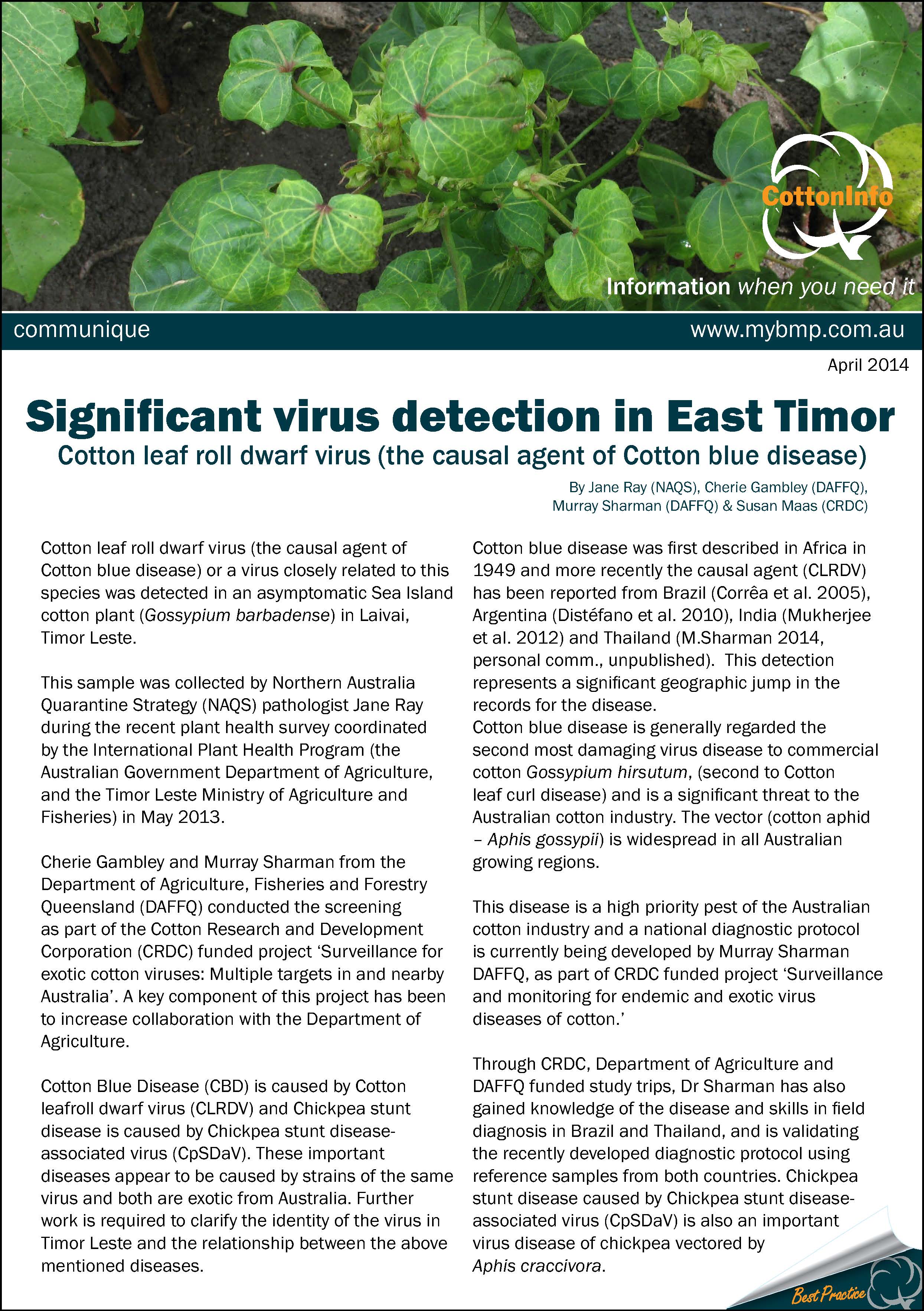 This fact sheet outlines the identification of cotton leaf roll dwarf virus (the casual agent of cotton blue disease; a high priority pest of the Australian cotton industry) or a virus closely related to this species in Timor Leste, and the best practice measures Australian growers shou