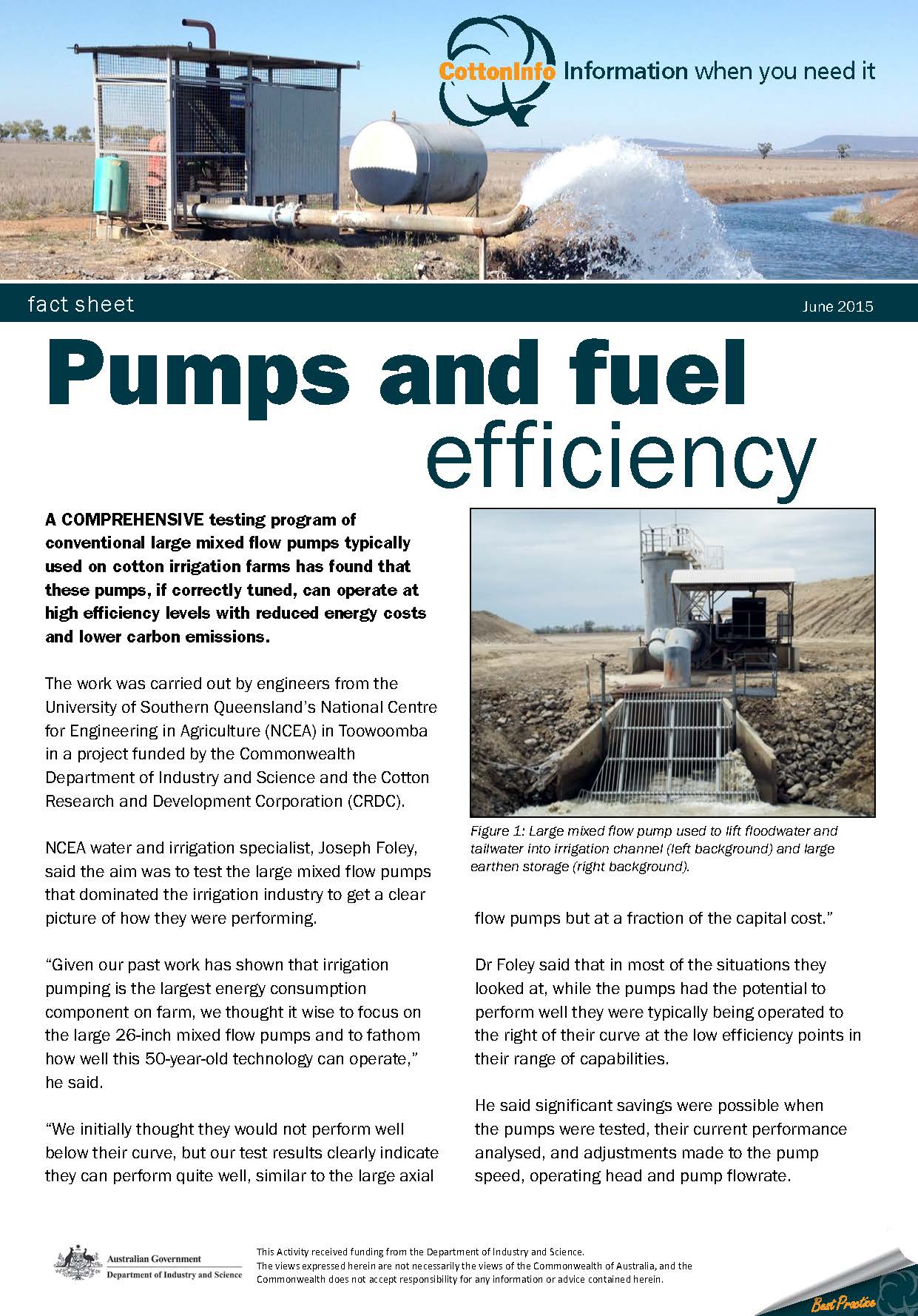A comprehensive testing program of conventional large mixed flow pumps typically used on cotton irrigation farms has found that these pumps, if correctly tuned, can operate at high efficiency levels with reduced energy costs and lower carbon emissions.