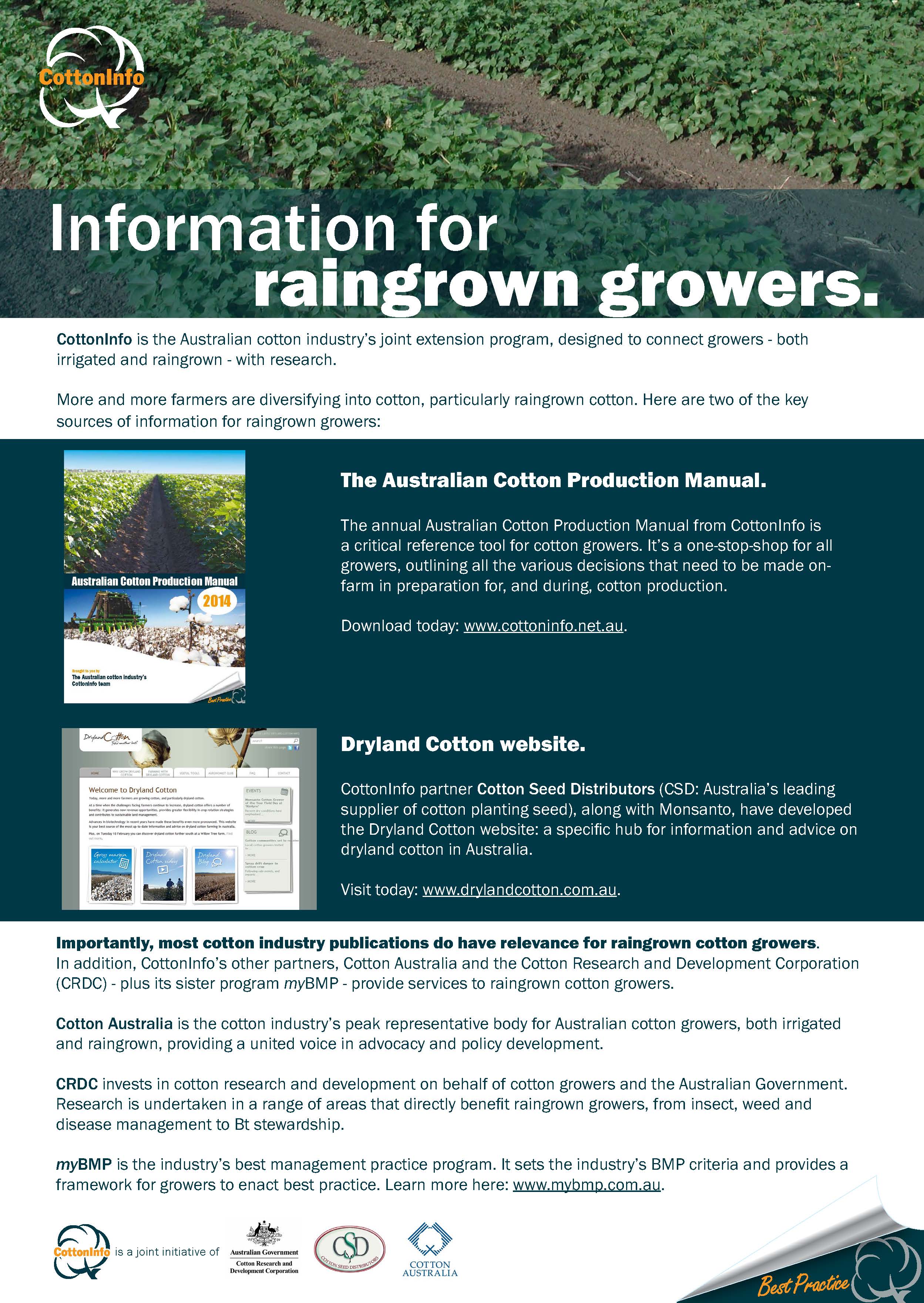 This information sheet outlines the key sources of cotton RD&E information for raingrown (formerly dryland) cotton growers.