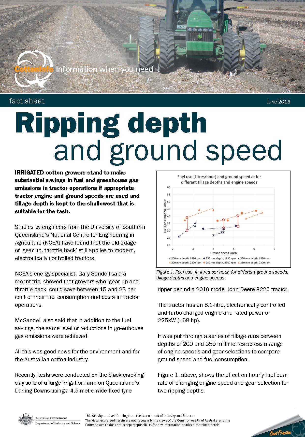 Irrigated cotton growers stand to make substantial savings in fuel and greenhouse gas emissions in tractor operations if appropriate tractor engine and ground speeds are used and tillage depth is kept to the shallowest that is suitable for the task.