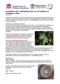 Further to the Vert Alert! re the new strain of defoliating verticilium, CottonInfo, NSW DPI and QLD DAF are asking cotton growers to look for Verticillium wilt disease symptoms and to send samples of suspect plants to the Department in their respective states. This will assist the Department's to determine the distribution of the new strain and to understand the pathogen further.