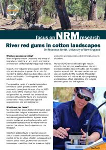 The Focus on NRM research series introduces you to the key cotton NRM researchers and their work. In this case study, Dr Rhiannon Smith outlines how river red gums contribute important ecosystem services to cotton growers, including the provision of habitat for fauna and biodiversity conservation value, carbon storage and sequestration, and soil stabilisation.