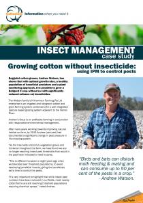 Boggabri cotton grower, Andrew Watson, has shown that with optimal growth rates, a healthy population of beneficial predators and a plant monitoring approach, it is possible to grow a Bt cotton crop without (or with significantly reduced reliance on) insecticides. This case study (part of the CottonInfo case study series) investigates.