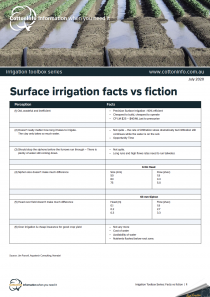 The CottonInfo Irrigation Toolbox Series provides key resources for irrigators. It includes factsheets and videos to help managers and farm staff better understand best practices for an efficient irrigation. This is factsheet #1: Surface irrigation facts vs fiction.