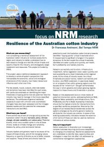 The Focus on NRM research series introduces you to the key cotton NRM researchers and their work. In this case study, Dr Francesa Andreoni outlines her work in completing a resilience assessment of the Australian cotton industry at multiple scales (farm, region and industry).